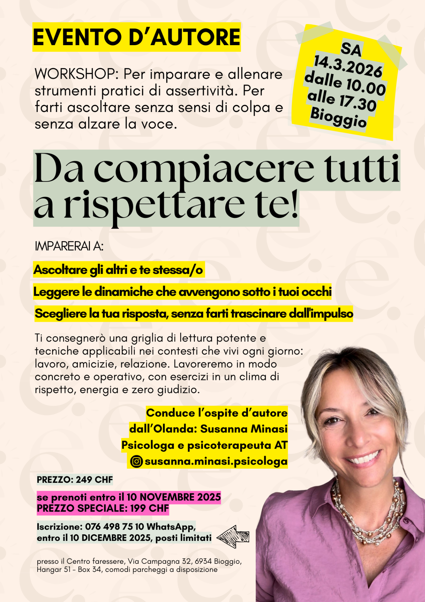 Al Centro Faressere ospitiamo, in occasioni speciali, professionisti indipendenti riconosciuti e apprezzati nel loro settore, che portano la loro esperienza in workshop, conferenze e attività uniche. Appuntamenti speciali, pensati per arricchire il nostro calendario con momenti di crescita, ispirazione e benessere.