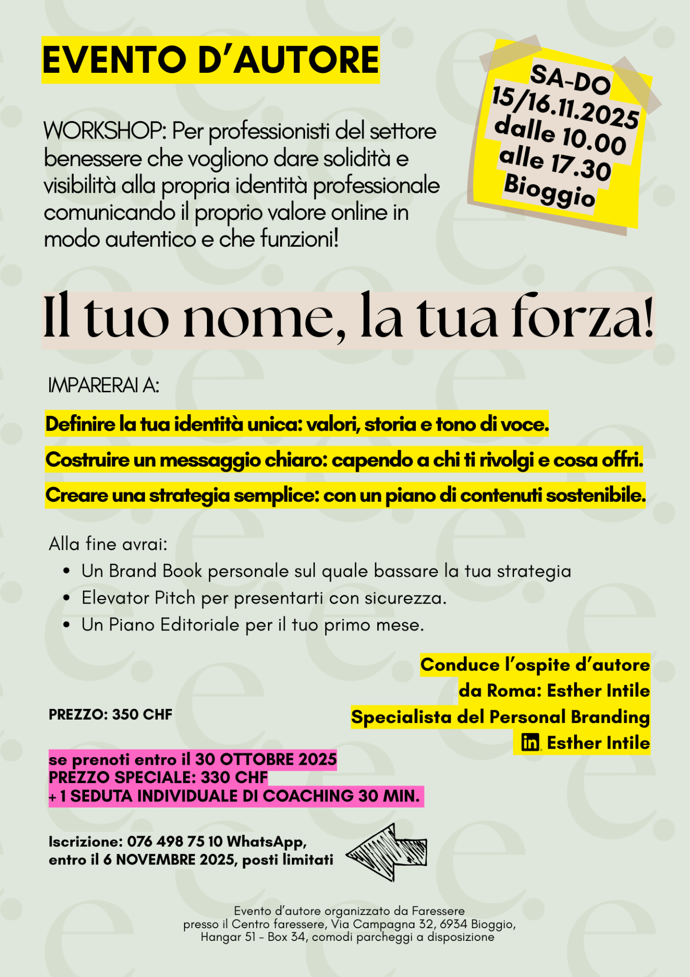 Un'occasione davvero speciale: abbiamo il privilegio di ospitare, in esclusiva per il nostro Centro, Esther Intile, Specialista del Personal Branding. Direttamente da Roma, Esther porterà la sua esperienza e la sua competenza in un incontro unico, pensato per offrire un'esperienza formativa e trasformativa di altissimo livello.