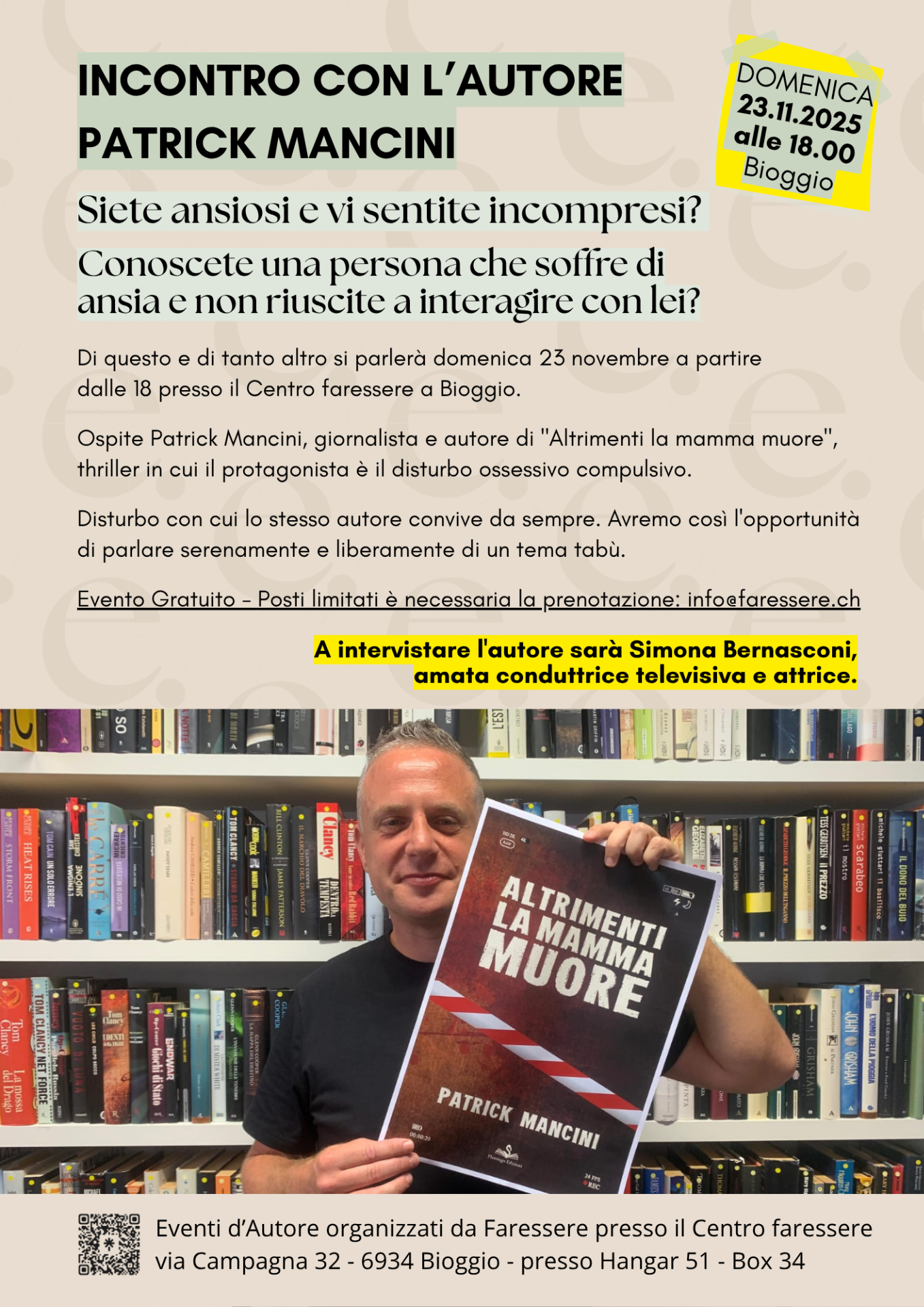 Ospite Patrick Mancini, giornalista e autore di "Altrimenti la mamma muore", thriller in cui il protagonista è il disturbo ossessivo compulsivo.